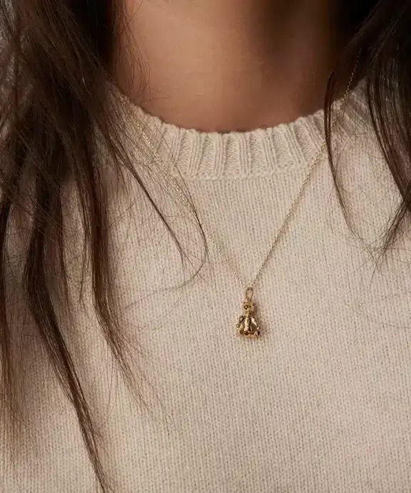 Kay Bojesen Jewelry Bjørn vedhæng i forgyldt sølv er et smykke, der elegant forener dansk designtradition med et varmt og eksklusivt udtryk. Vedhænget er inspireret af Kay Bojesens ikoniske bjørn, som i årtier har været et symbol på charme, personlighed og tidløst formsprog.