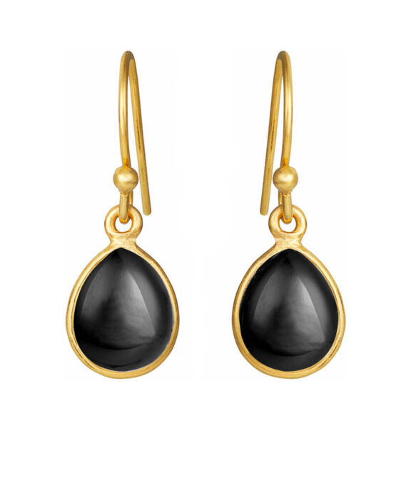 Disse skønne øreringe er fremstilet i guldbelagt sterling sølv. Øreringene er designet som ørehængere, som har en cabochon formet sort agat sten hængene fra bøjlen. Stenen måler 8×10 mm.