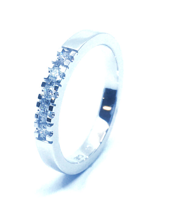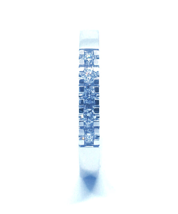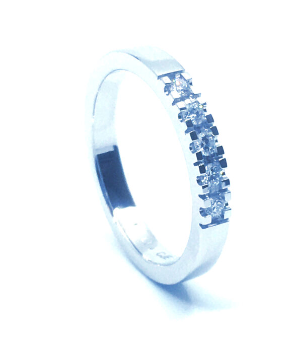 De funklende diamanter er smukt fordelt langs ringskinnen og tilfører et luksuriøst udtryk, uden at det bliver prangende. Et ideelt valg som vielsesring, jubilæumsgave eller et personligt smykke, der fortæller sin egen historie.