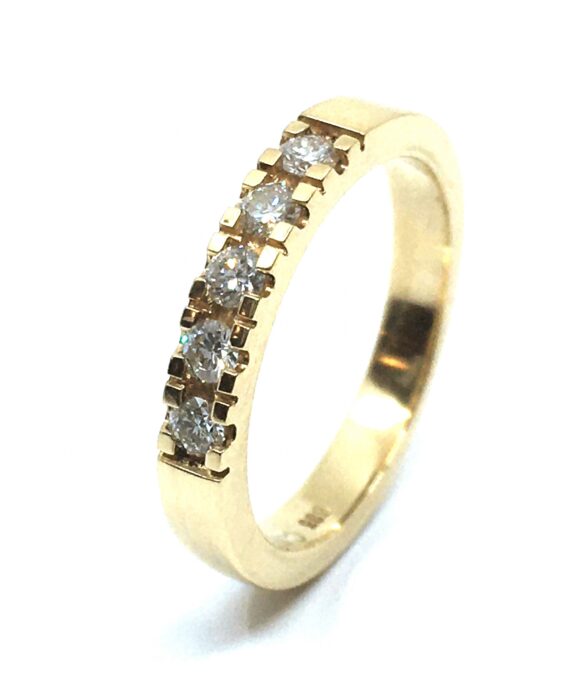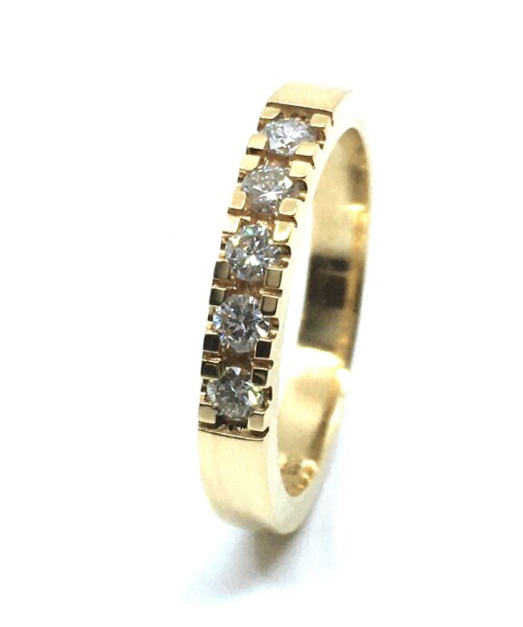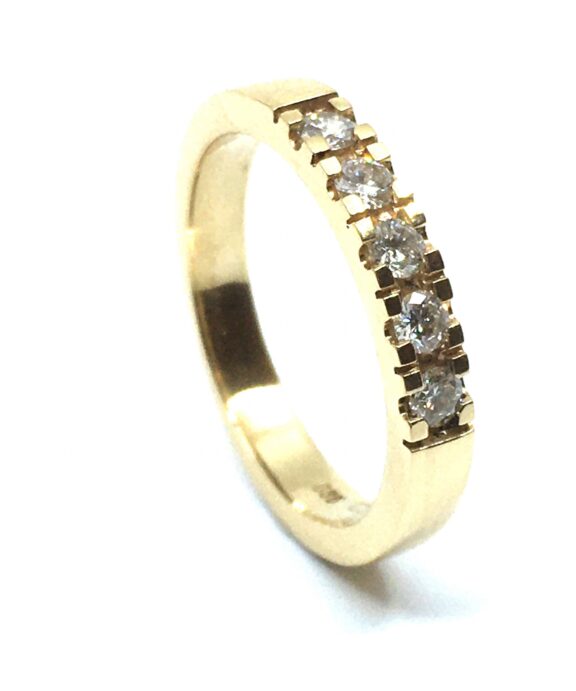 I denne særlige model er der indfattet fem brillanter, som er diamantslebne sten. Hver med et brilliant-snit er kendt for at maksimere stenens evne til at reflektere lys og skabe en betagende glans. De fem brillanter har en samlet vægt på 0,25 carat, hvilket betyder at hver sten er 0,05 carat i vægt. Brillanterne er jævnt fordelt hen over ringens overflade og skaber en sofistikeret og harmonisk symmetri.