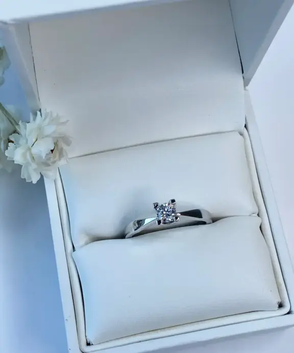I centrum af ringen er en smukt indfattet brillant, som vejer 0,05 carat. Brillanten er slebet i et brilliant-snit, der maksimerer stenens lysreflektering og skaber en intens glans. Stenen har en farvegrad af Wesselton, som betyder, at den er næsten farveløs og ligger højt på farveskalaen for diamanter. Kvaliteten af klarheden er SI (Slightly Included), hvilket betyder, at stenen har små indeslutninger, der dog kun er synlige ved nærmere inspektion under forstørrelse, men ikke forringer dens skønhed ved almindelig brug.