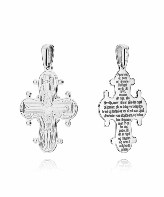 Dagmarkorset er lavet i massiv 925 sterling sølv med Jesus på forsiden og teksten med fadervor på bagsiden.