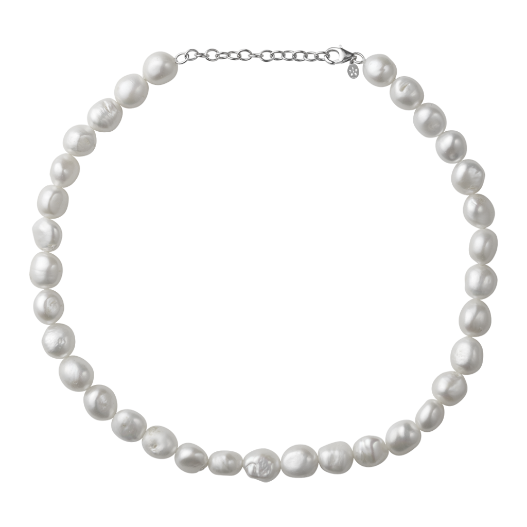 Super moderne perlekæde med store rustikke ferskvandsperler. Kæden er 45cm med justerbart stykke i sølv. Perlerne er 9,5-10,5 i diameter. I serien AURA findes også ørestikker, hoops og andre halskæder.