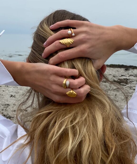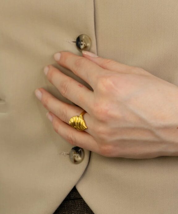 Ringen er en elegant ring designet i forgyldt sølv, inspireret af naturens organiske former. Ringen har et bølgende, sandet mønster, der symboliserer de rolige og smukke sanddyner. Den forgyldte finish tilføjer et luksuriøst touch, hvilket gør denne ring perfekt til både hverdagsbrug og specielle lejligheder. Med sin enkle, men markante stil, giver den et sofistikeret og tidløst udtryk.