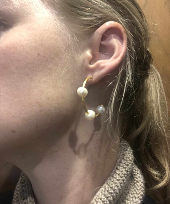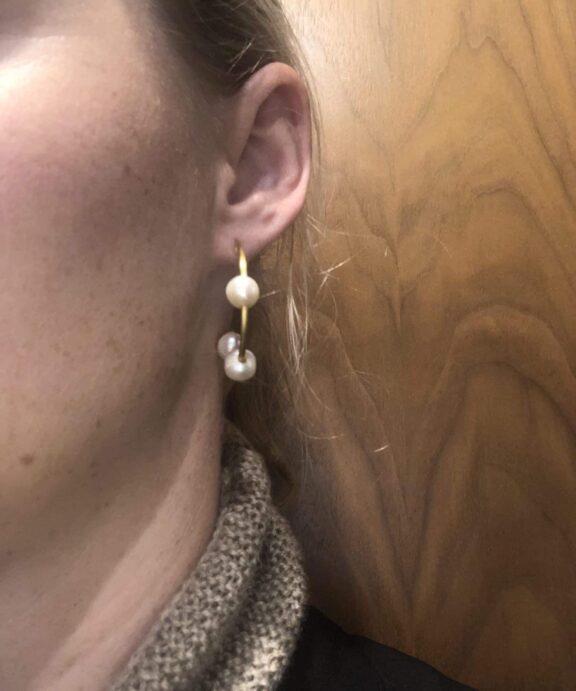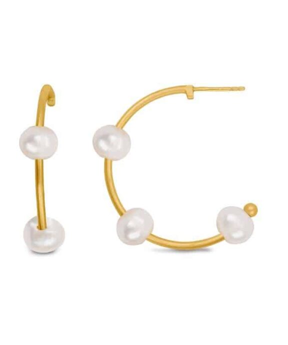 Alle smykker fra bybiehl er produceret i genanvendeligt sølv med en forgyldt mat overflade, disse øreringe er en stor hoop med 3 hvide ferskvandsperler.