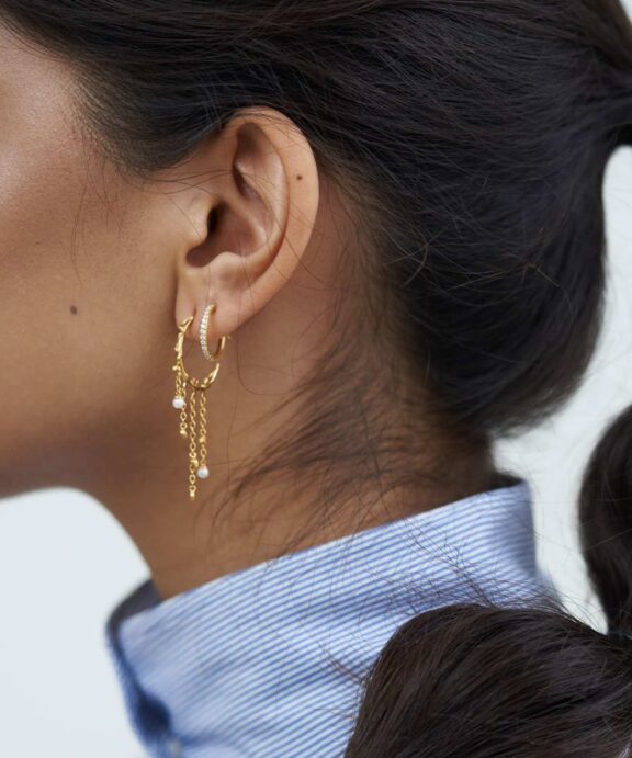 Øreringene er det perfekte miks af enkelthed og eksklusivitet. Disse fine øreringe fra BYBIEHL er fremstillet i 18 karat forgyldt sterlingsølv og smukt dekoreret med funklende zirkonia-sten, der fanger lyset med hver bevægelse.