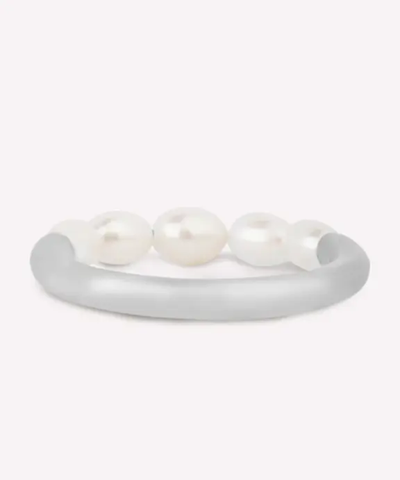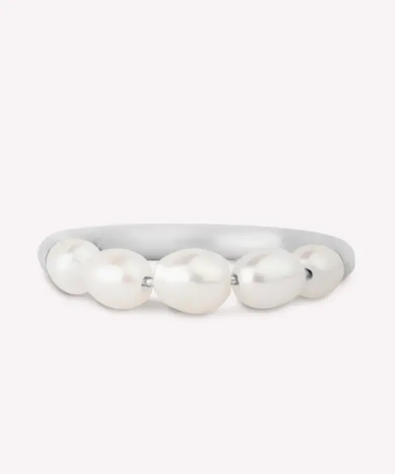 Enkelt og smuk ring, som vil passe til hver en anledning. Ringen har 5 hvide ferskvandsperler. Ringen måler 2 mm i bredden og vil derfor bære sig smukt som enkelt ring, men også sammensat med flere. Ringen er en del af Aura serien, som indeholder ringe, armbånd, halskæder og øreringe i sterling sølv og forgyldt sterling sølv.