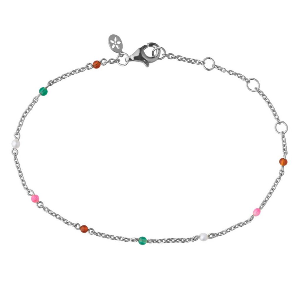 Super flot sølv armbånd med grøn agat, rød agat hvid perle og lyserød farvet jade sted fordelt på armbåndet