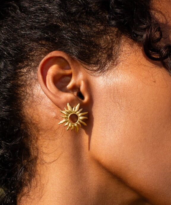 Øreringene er et par elegante iøjnefaldende øreringe fra ByBiehl, der kombinerer den varme glød fra forgyldt sølv med den naturlige inspiration fra solens kraft og energi. Øreringene er en del af Sun Wild-kollektionen, som fejrer naturens rå og frie skønhed.