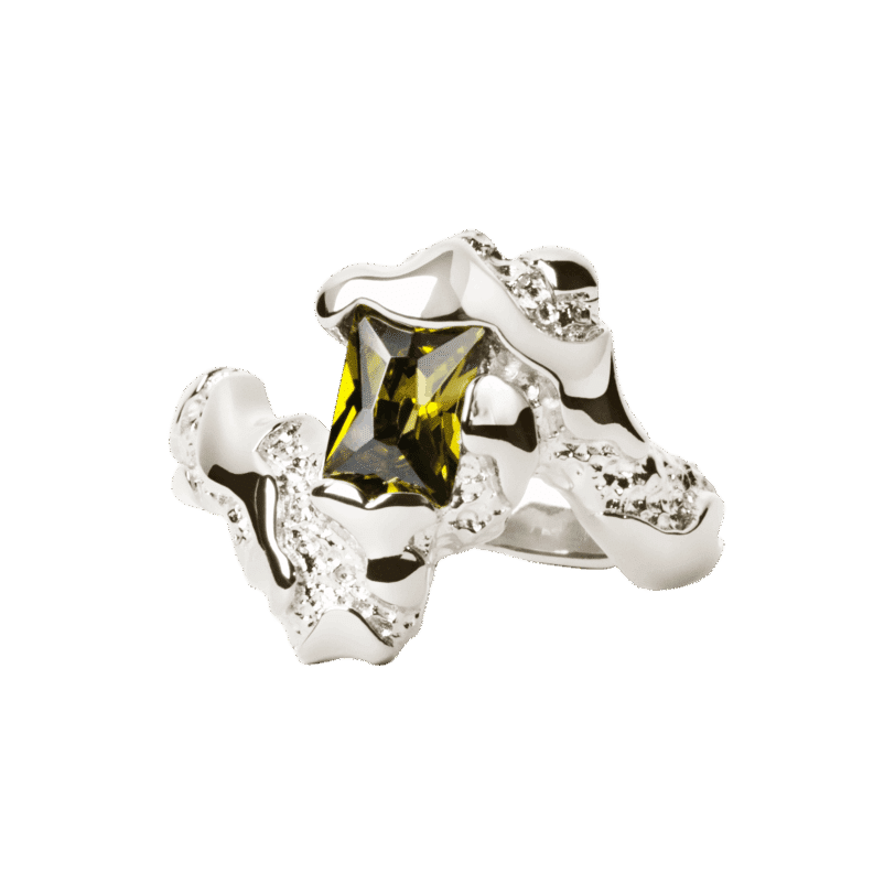 Den grønne sten tilfører et frisk pust af farve, som elegant kontrasterer det kølige sølv og giver ringen sit karakteristiske udtryk.