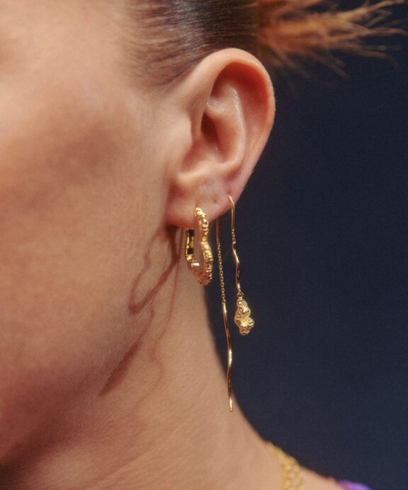 Øreringene er elegante og moderne øreringe i forgyldt sølv. Designet har et sofistikeret, struktureret udtryk, der kombinerer stil og elegance. Øreringene har en smuk, varm guldfinish, som giver dem et luksuriøst look, der passer perfekt til både hverdag og festlige anledninger. Et ideelt valg for dem, der ønsker et tidløst og iøjnefaldende smykke med en moderne kant.