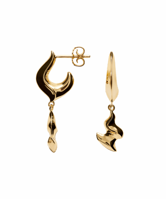 Håndlavet i ægte 925 sterling sølv og forgyldt med et smukt lag 22 karat guld, forener de det skulpturelle med det eksklusive – et smykke for den moderne kvinde, der tør skille sig ud. Øreringenes dynamiske form kaster smukke refleksioner og tilfører både kant og varme til enhver stil.