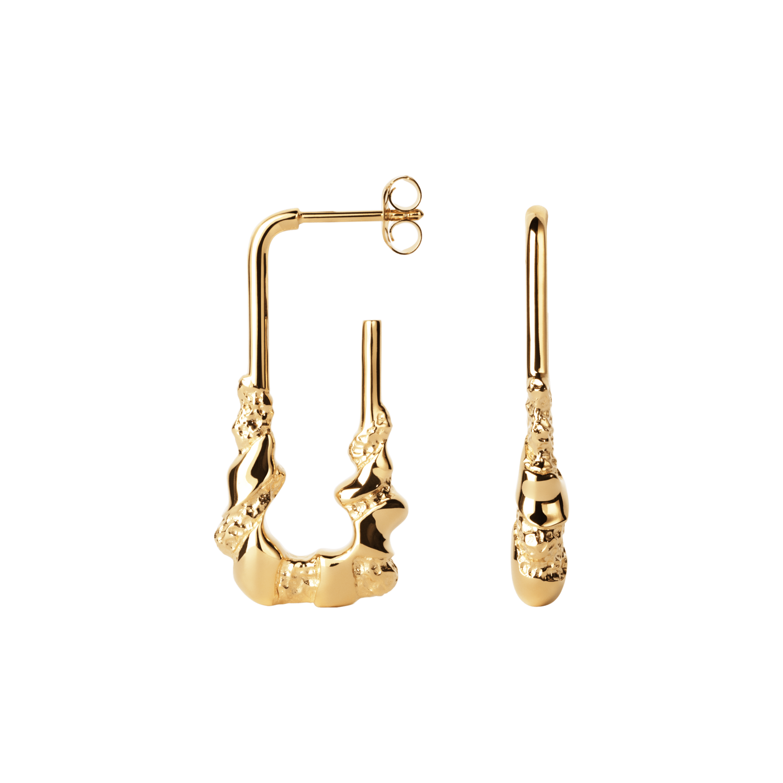 Det kontrastfyldte design kombinerer skinnende overflader med et moderne formsprog, hvilket giver øreringene et eksklusivt og iøjnefaldende look. Den forgyldte finish tilfører en varm glød, der fremhæver dine ansigtstræk og giver dit outfit et sofistikeret løft.