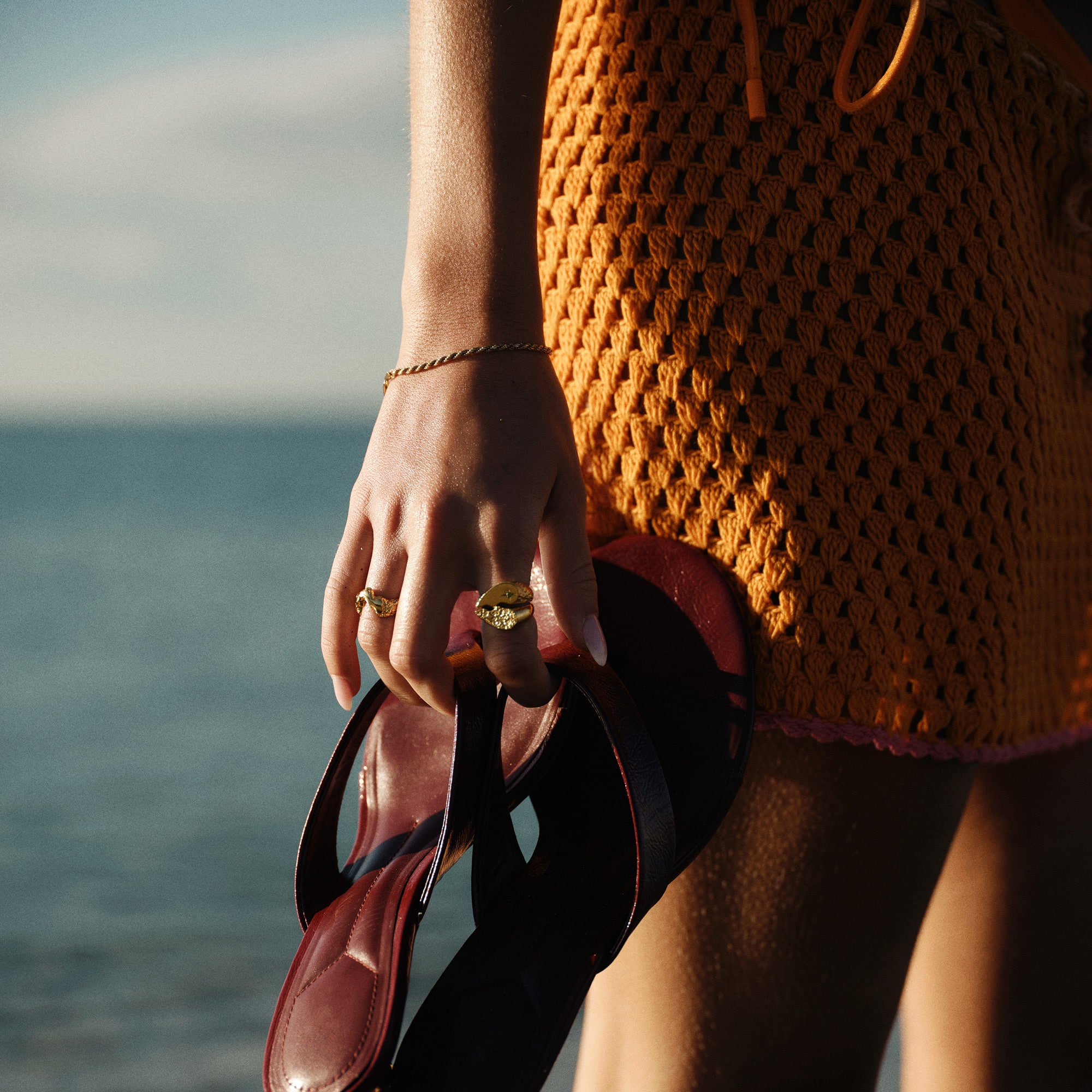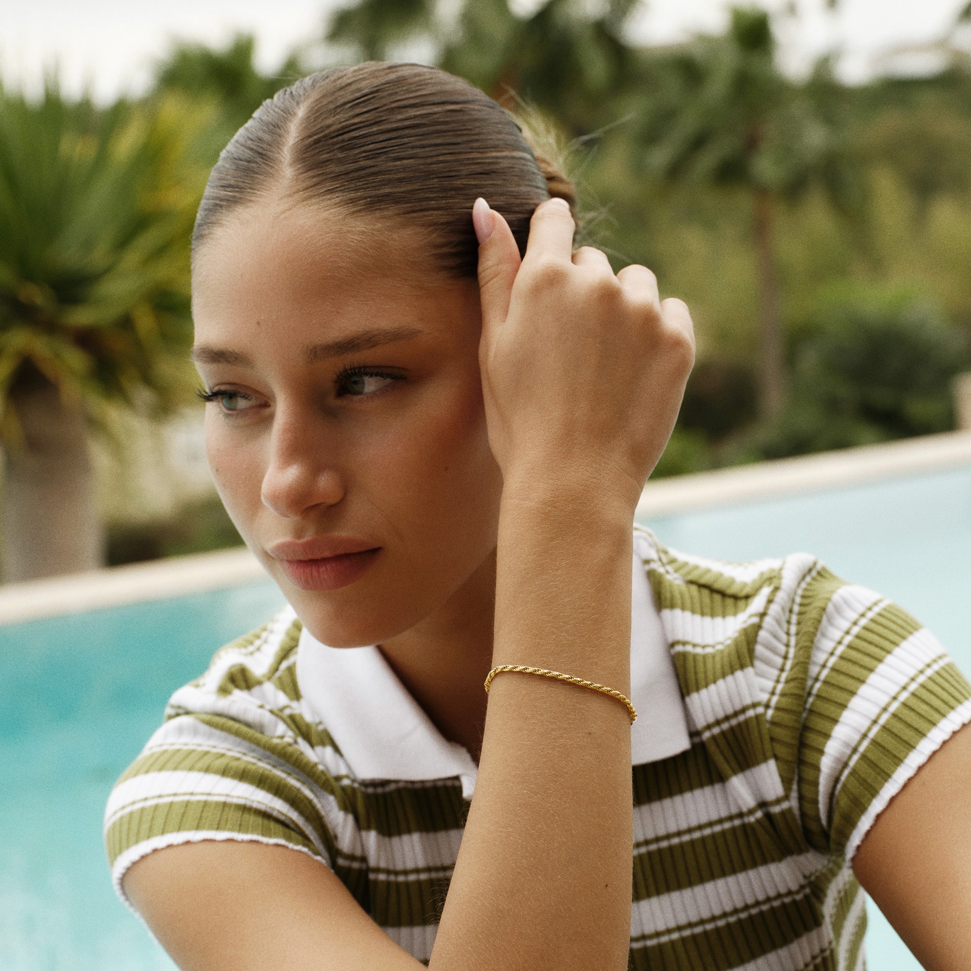Det kraftige twist giver armbåndet karakter og dybde, mens den varme forgyldning tilfører et luksuriøst touch. Armbåndet kan bæres alene som et stilrent statement eller kombineres med andre armbånd for et mere personligt og lag-på-lag look.