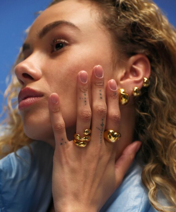 Ringen er en moderne og iøjnefaldende ring. Ringen er fremstillet af sterlingsølv, som derefter er belagt med et lag af 22 karat guld. Den forgyldte overflade skaber en skinnende glans, som fremhæver ringens form og detaljer.