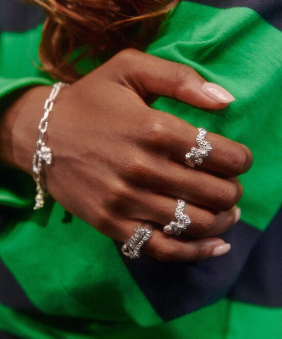 Designet af ringen er inspireret af bløde, organiske former, hvilket skaber en let og luftig fornemmelse. Den unikke “crush”-effekt giver ringen en dynamisk tekstur, der fanger lyset på smukt vis, hvilket gør den til et iøjnefaldende accessory. Ringen er også justerbar, hvilket sikrer en komfortabel pasform til forskellige fingerstørrelser.