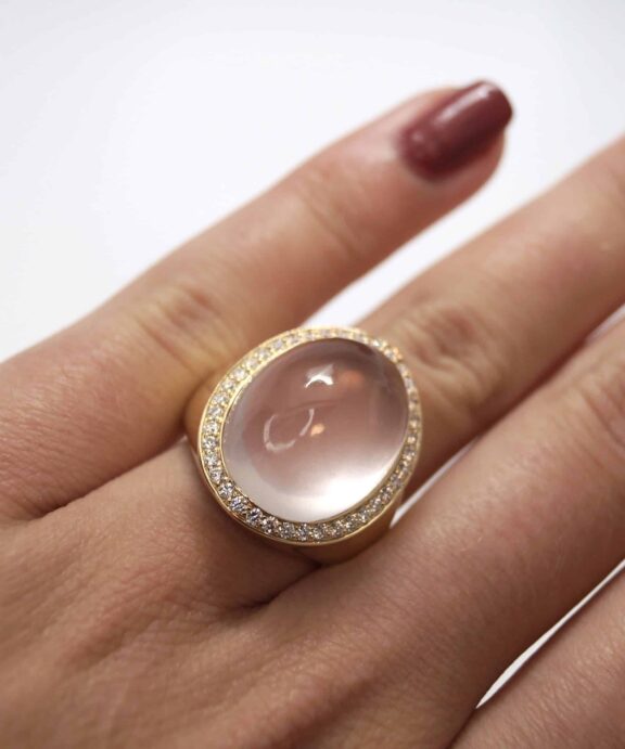 I ringen sidder en stor rosakvarts omkranset af 0,55 ct brillanter.