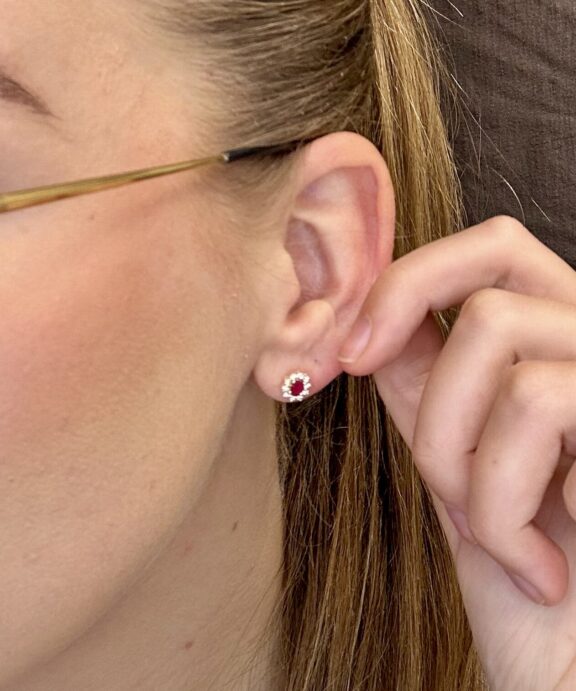 I hver ørestik sidder en rød rubin omkranset af 0,19 carat brillanter i kvaliteten w/si.