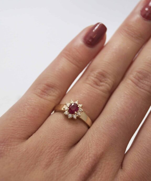 I ringen sidder en rød rubin omkranset af 0,15 ct brillanter i kvaliteten w/si.