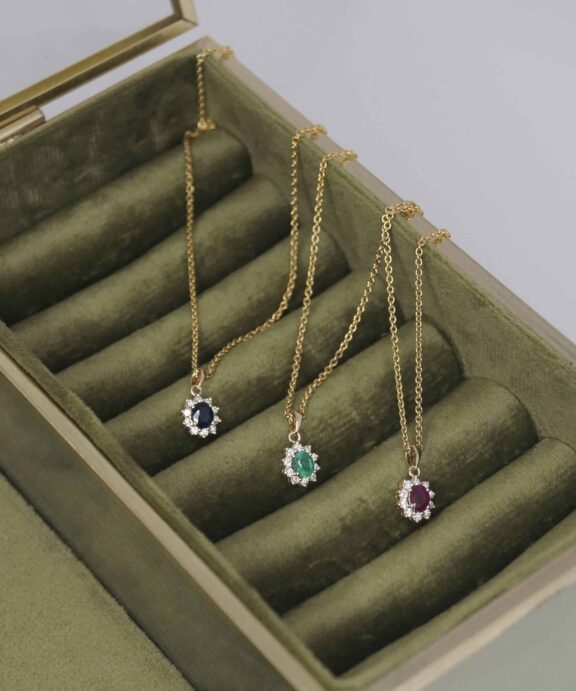 I vedhænget sidder en blå safir omkranset af 0,15 carat brillanter i kvaliteten w/si.