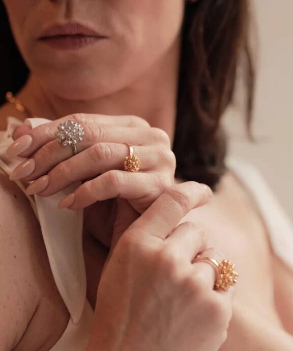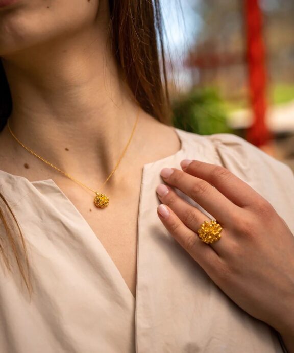 Denne fine statement ring med dild er fremstillet i sterling sølv og forgyldt med 22 karat guld. Ringen måler ca. 20mm på toppen. Den er justerbar og fås i 3 str. small/medium/large. Flora Danica har lavet denne ring i anledningen af deres 70 års jubilæum.