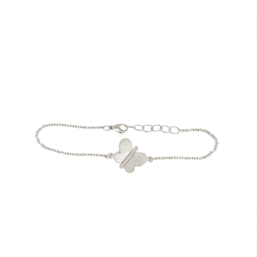 Butterfly armbånd fremstillet i rhodineret sterlingsølv med en mat overflade. Armbåndet har et lille forlængerstykke så det kan regulgeres fra længde 16cm – 18cm