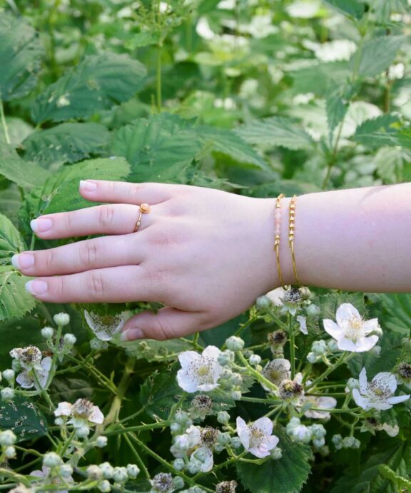 Armringen er fremstillet i 925 forgyldt sterling sølv med en top af 5 forgyldte kugler, du kan vælge mellem 21 forskellige toppe og skifte mellem dine favoritter.