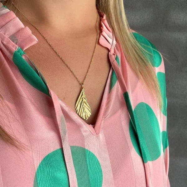 Det naturlige bladmønster symboliserer vækst, livskraft og fornyelse – en smuk påmindelse om naturens enkelhed og skønhed. Størrelsen gør det ideelt som et blikfang alene, men også elegant at kombinere med andre smykker for et personligt udtryk.