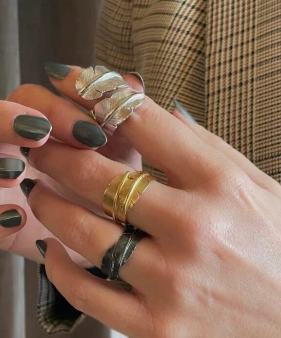 Den brede udgave af Fjer ringen gør den til et markant smykke, som både kan bæres alene som statement-ring eller kombineres med andre smykker for et personligt look.