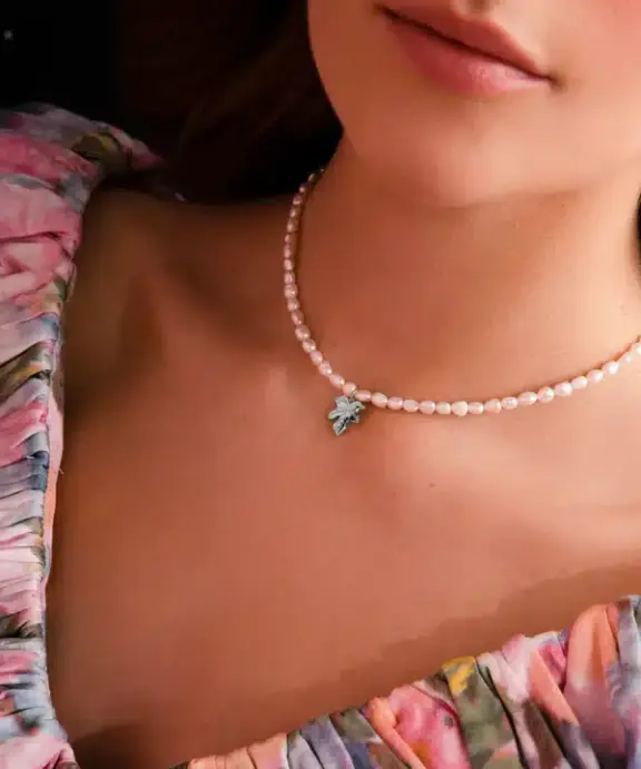 Bladet i midten giver kæden et mere ungdommelig look til den klassiske perlehalskæde.