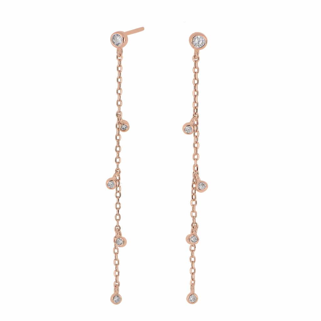 Øreringene er fremstillet i rosaforgyldt sterlingsølv. Stenene, der så fint pynter de smukke ørekæder, er hvide syntetiske zirkonia.