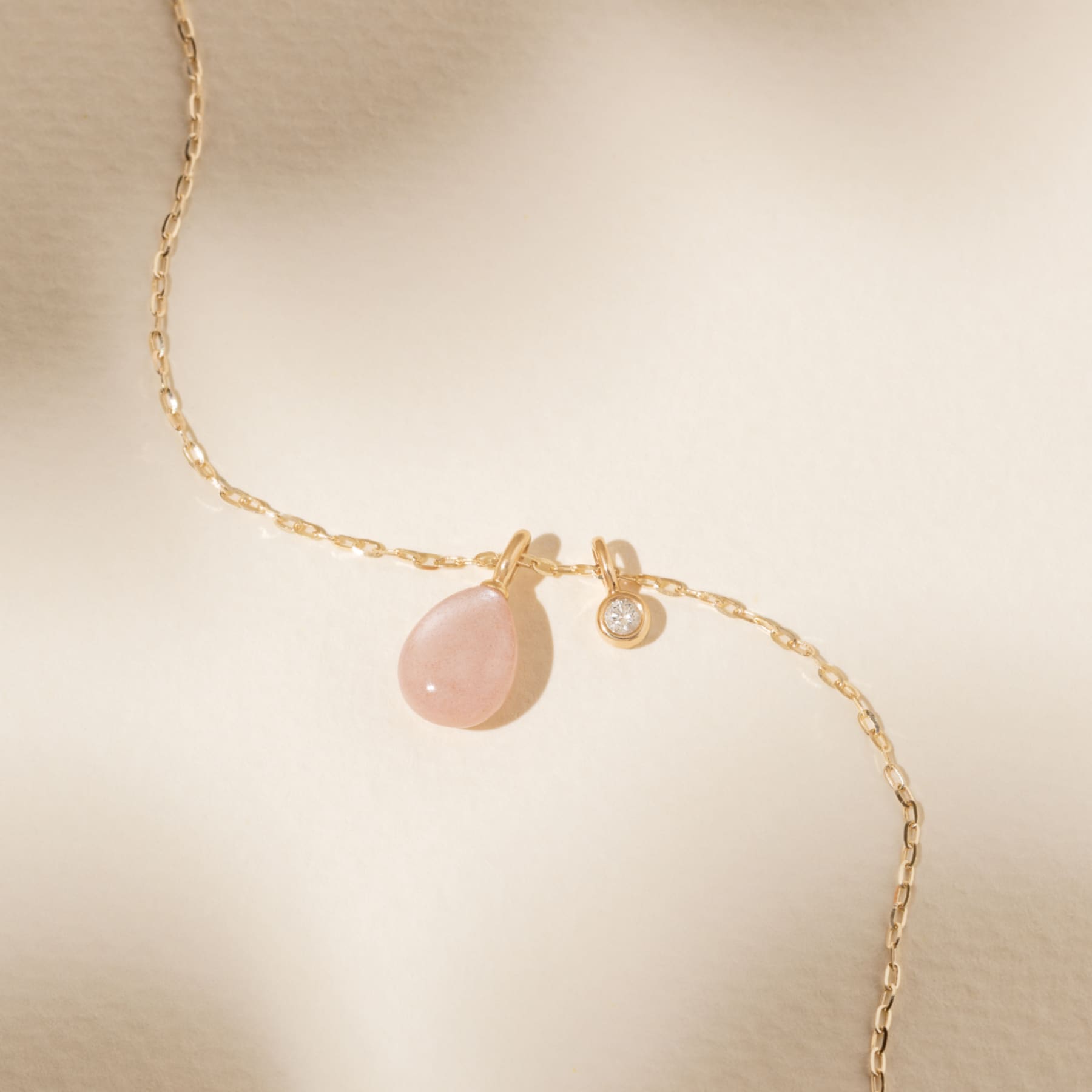 Vedhænget er udført i ægte 14 karat guld og prydet med en smuk rosy moonstone, der med sit bløde lyserøde skær tilfører varme og lethed til dit look. Stenens fine farvespil giver smykket et eksklusivt og levende udtryk, som elegant fanger lyset og fremhæver din naturlige udstråling.
