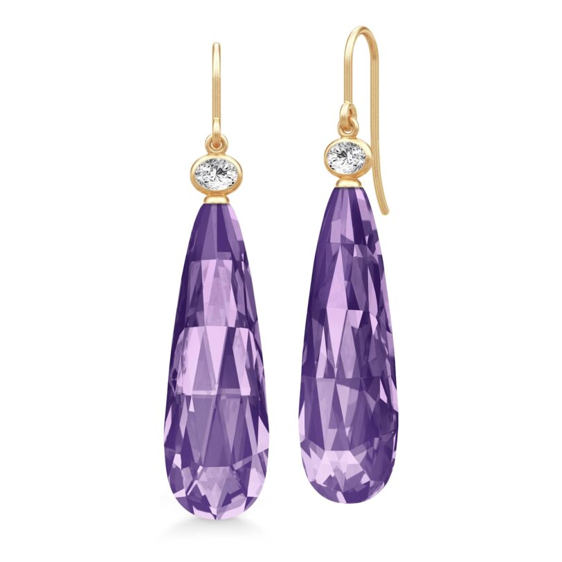 Midtpunktet er en dråbeformet ametystfarvet krystal, der med sin dybe lilla nuance skaber et smukt samspil med guldbelægningen. Rundt om stenen er der klare kubiske zirkonia, som tilfører ekstra glans og et sofistikeret udtryk.