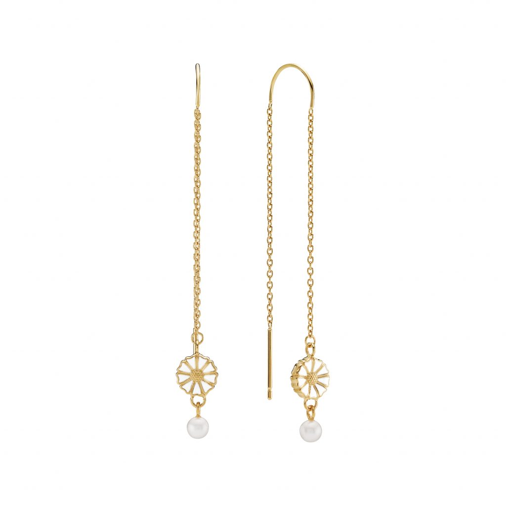 Øreringe med marguerit, kæde og en fin lille ferskvandskulturperle i bunden.