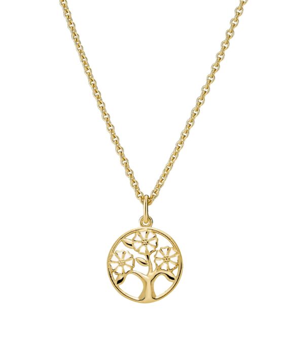 Sølv forgyldt halskæde med livets træ. Vedhænget som er livets træ er der også margueritter og den måler 18 mm. Kæden er en rund anker på 45+3 cm, som kan ombyttes efterfølgende.