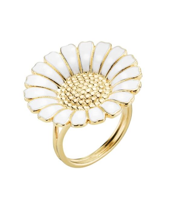 Sølv forgyldt ring marguerit med hvid emalje. Margueritten måler 25 mm i diameter og er forgyldt med en 24 karat forgyldning. Størrelsen på margueritter er større end den gennemsnitlige marguerit.