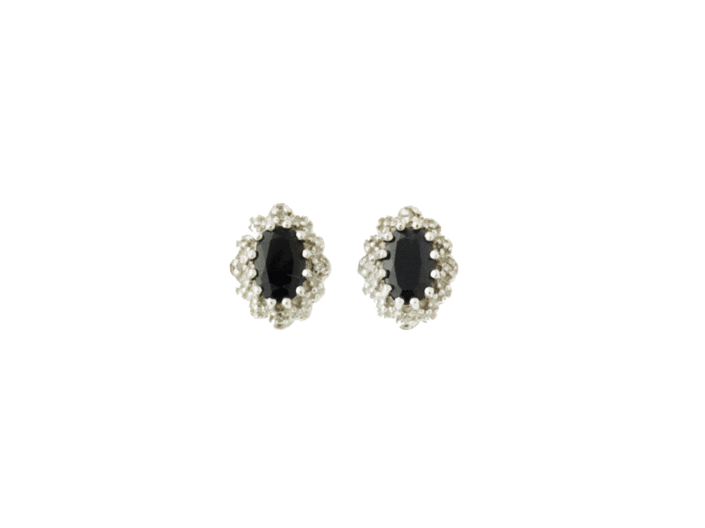 Denne fine og klassiske ørestik er lavet i 14karat hvidguld. Ørestikken har to flotte mørke safirer siddende i midten og er omsluttet af 8 fine små diamanter der er brilliantslebet. En virkelig klassisk ørestik der sender tankerne mod Prinsesse Dianas forlovelsesring.