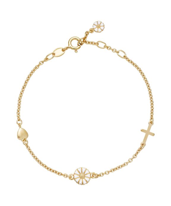 Super fint armbånd med marguerit, hjerte og kors samlet i et.