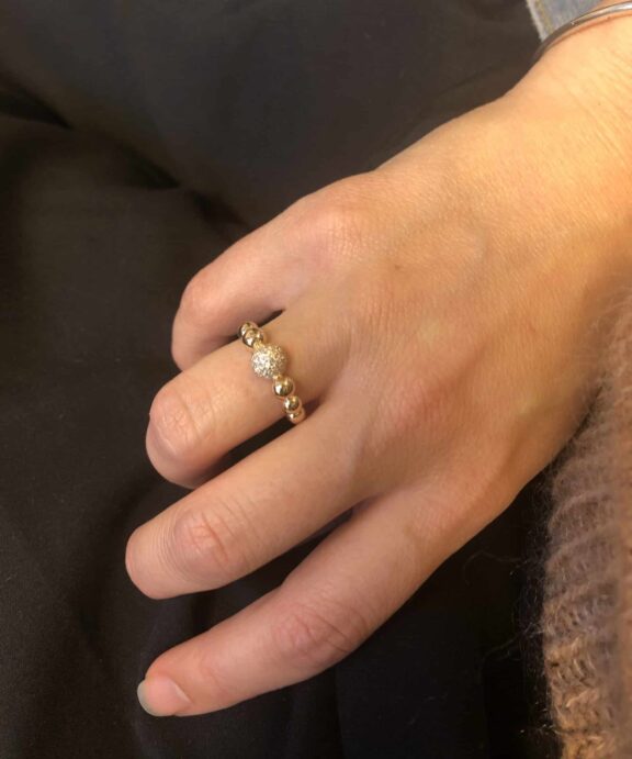 Ring i 14 karat guld med en kugle på toppen af 0,27 ct. W.SI diamanter, resten af ringen er udformet i små kugler hele vejen rundt.