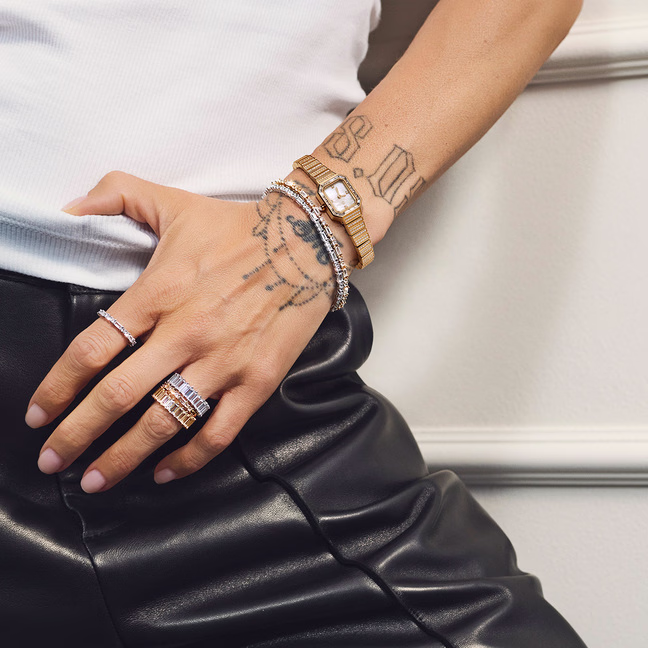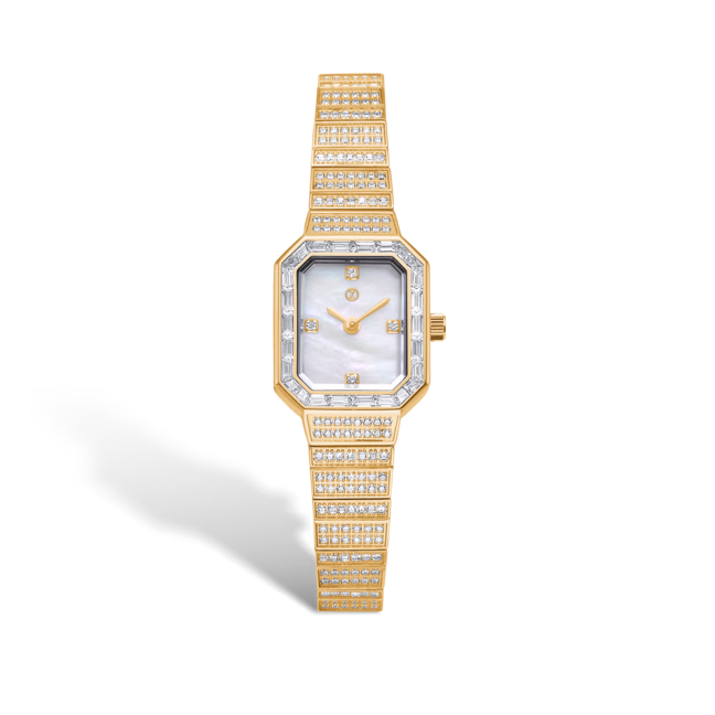 Uret er lavet i PVD forgyldt stål med baguetteslebne zirkonia sten langs urets lænke.