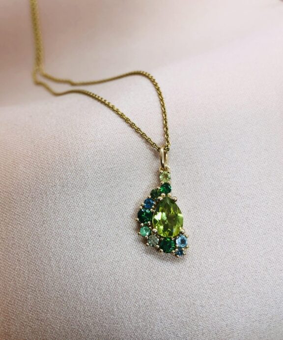 Vedhænget er i 14 karat guld med ægte stene. Stenene er grøn peridot, blå apatit, London blue topas, grøn safir, tsavorit og grøn turmalin. Vedhænget er en del af smykke serien Four Seasons. Serien består også af ringe og ørestikker i 4 farver og i 4 årstider og denne udgave er forår. Med vedhænget følger en sølv forgyldt halskæde. Guldkæde kan tilkøbes.