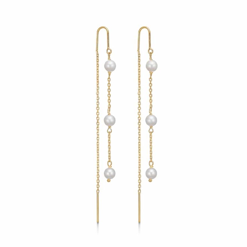 8 karat guld øreringe som hænger med ferskvands kultur perle. Øreringene trækker man igennem øret, men der er lavet en bøjle der hvor de skal sidde så de ikke falder ud.