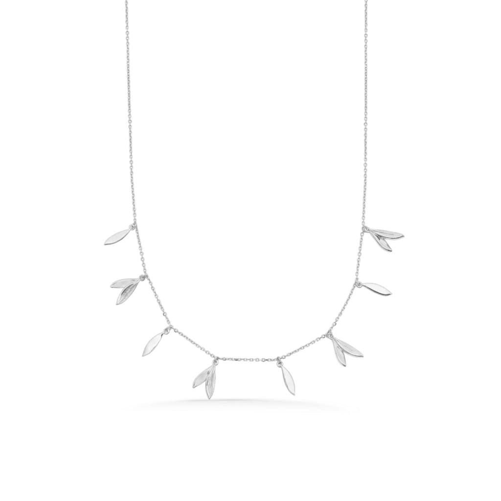 Flot sølv halskæde med små fjer som giver en flot bevægelse på halsen