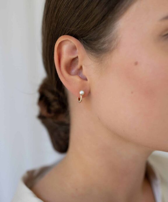 14 karat guld øreringe som creol med hvid ferskvands kultur perle. Creolen er vendbare så man kan enten vende perlen fremad eller brillanten. Brillanten er på i alt 0,03 carat i kvaliteten top wesselton/vs.