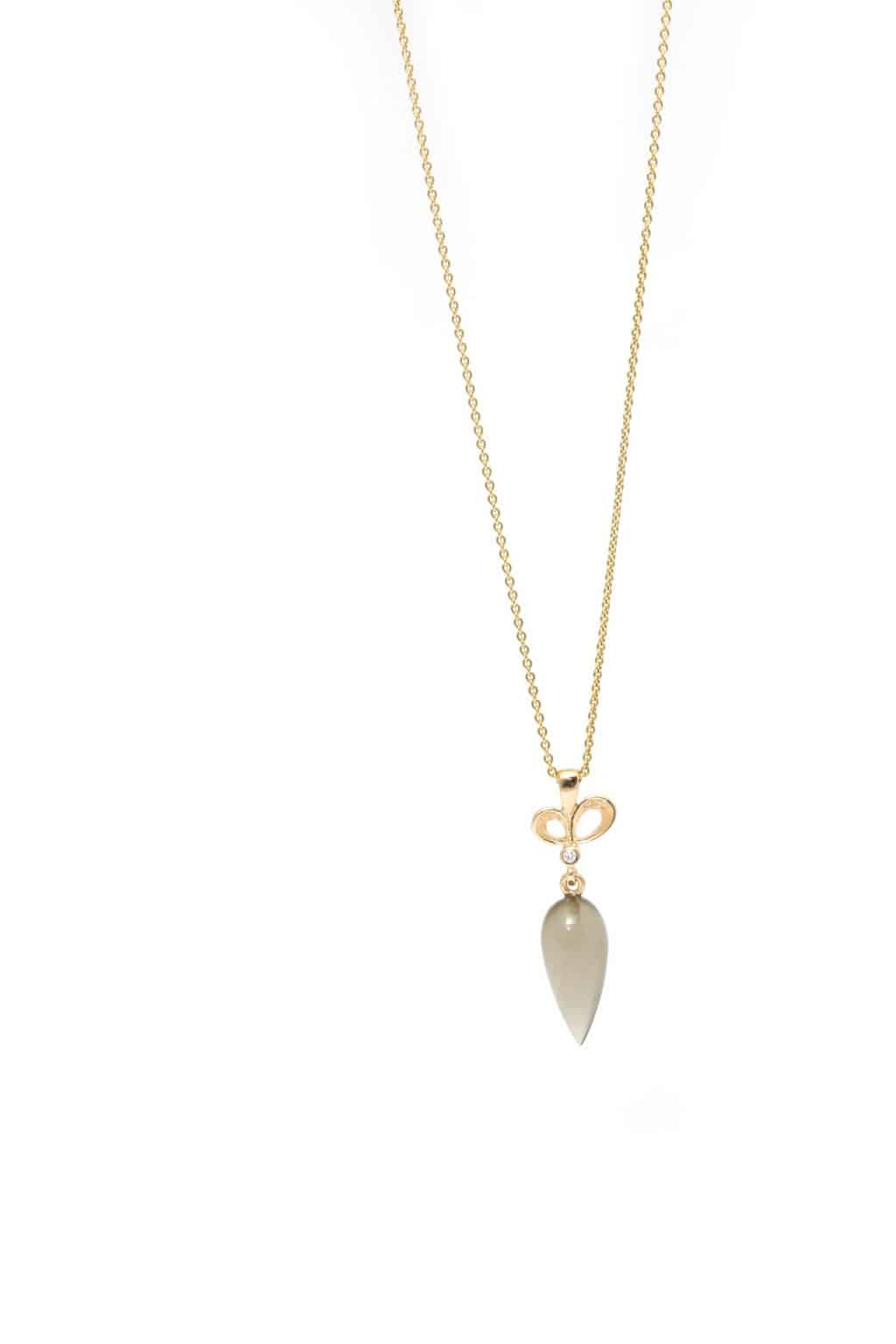 14 karat guld vedhæng med grå månesten. Selve den grå månesten måler 20 mm i længden. Vedhænget er uden kæde, men som kan tilkøbes. Kæden medfølger som er en sølv forgyldt rund anker kæde i 45 cm. Kæden kan om byttes efterfølgende.