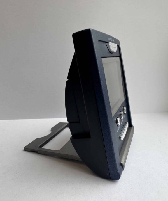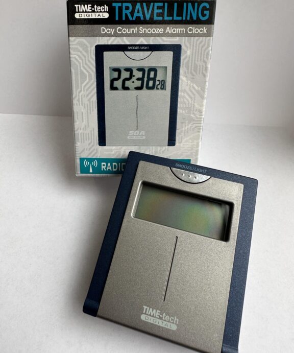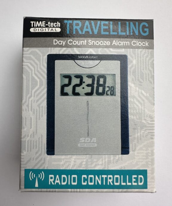 Kompakt, lille vækkeur , hvor klappen på forsiden beskytter knapperne, når uret er i kufferten og fungerer som fod, når uret skal stå på bordet.