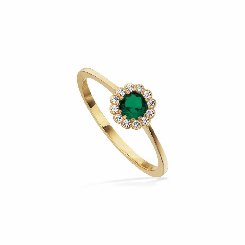 Elegant og klassisk roset ring, hvor den grønne sten er omringet med smukke hvide zirkoner. Den flotte grønne farve lyser flot op mellem de klare zirkoner.