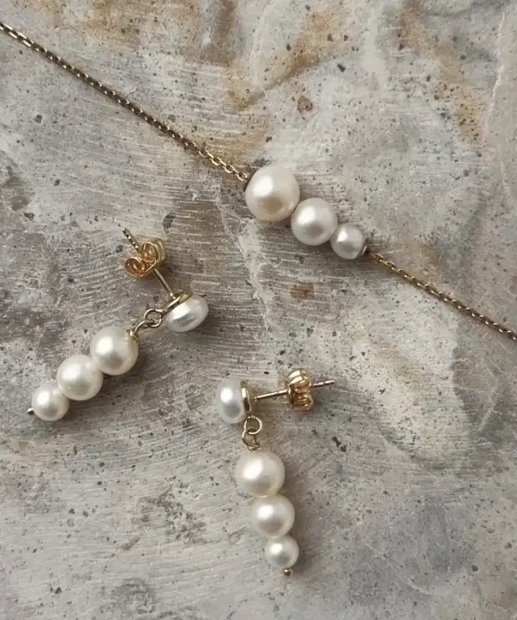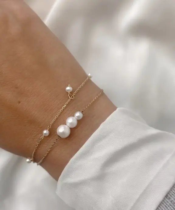 Armbåndet er designet med tre hvide ferskvandsperler.