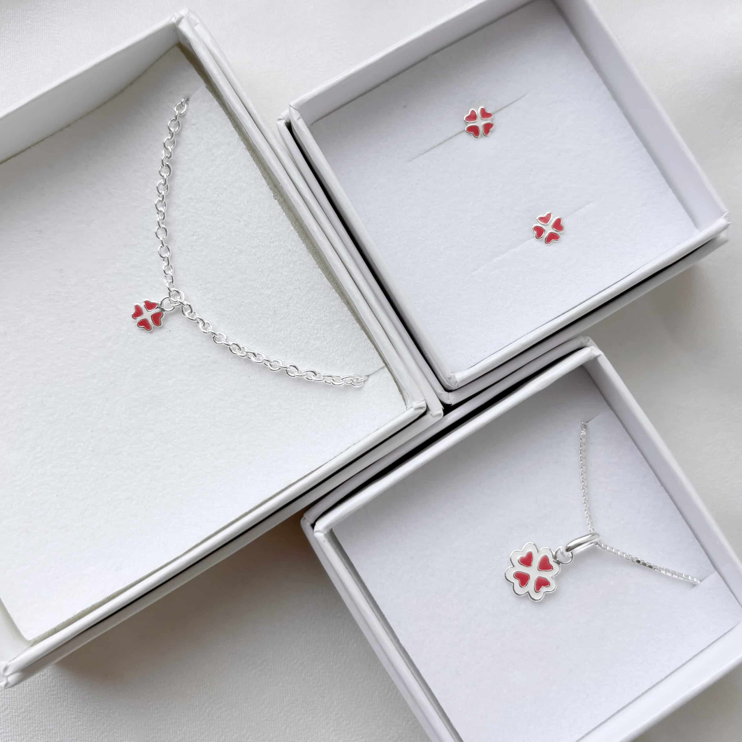 De små kløverblade i en smuk rød nuance symboliserer held og glæde. Sammen skaber det et sødt og feminint smykke, der passer perfekt til både hverdag og særlige øjeblikke.