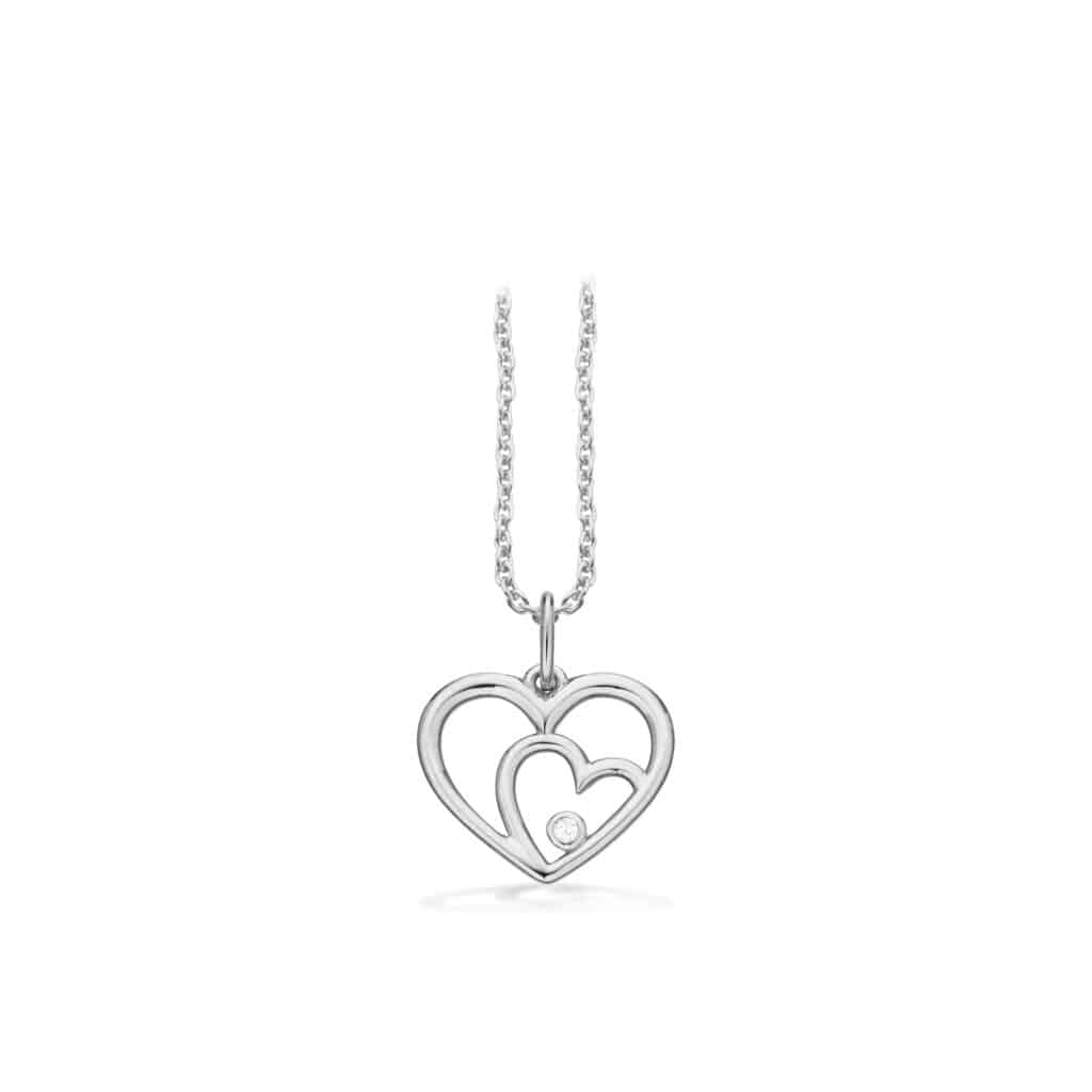 Elegant asymmetrisk halskæde med et 8 karat dobbelthjerte med en 0,0125 carat W/si brillant siddende i bunden. Perfekt at give til barselsgave eller mors dag.